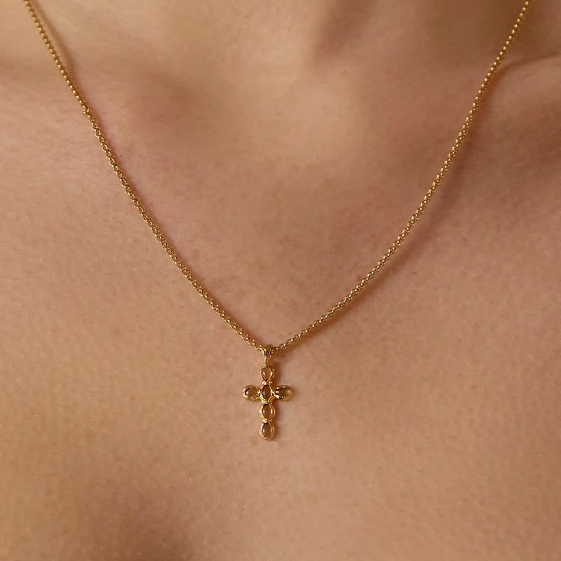 Die Halskette Nexa trägt einen feinen Kreuzanhänger als starkes, zeitloses Symbol für den Alltag. Der kleine Anhänger mit einer Höhe von 17 mm wirkt bewusst zurückhaltend und erhält durch den grünen Glasstein einen sanften Farbakzent. Das satinierte, vergoldete Finish verleiht der Halskette eine warme, matte Ausstrahlung und macht sie vielseitig kombinierbar, ob pur getragen oder im Layering mit weiteren Ketten.