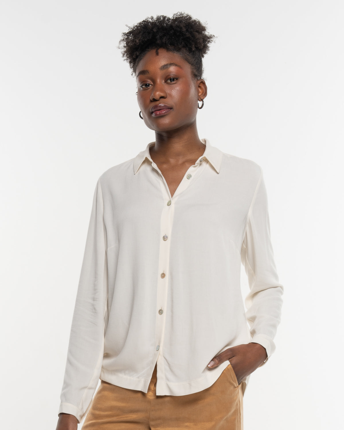 Die Hemdbluse Floral White vereint zeitlose Blusenklassik mit moderner Eleganz. Der lockere, gerade Schnitt sorgt für eine entspannte Silhouette, während der Hemdkragen, die Knopfleiste mit Perlmuttknöpfen und fein gearbeitete Manschetten einen stilvollen Rahmen geben. Mit ihrer fliessenden EcoVero-Qualität wird sie zum eleganten Allrounder für Büro, Dinner oder lässige Alltagslooks.