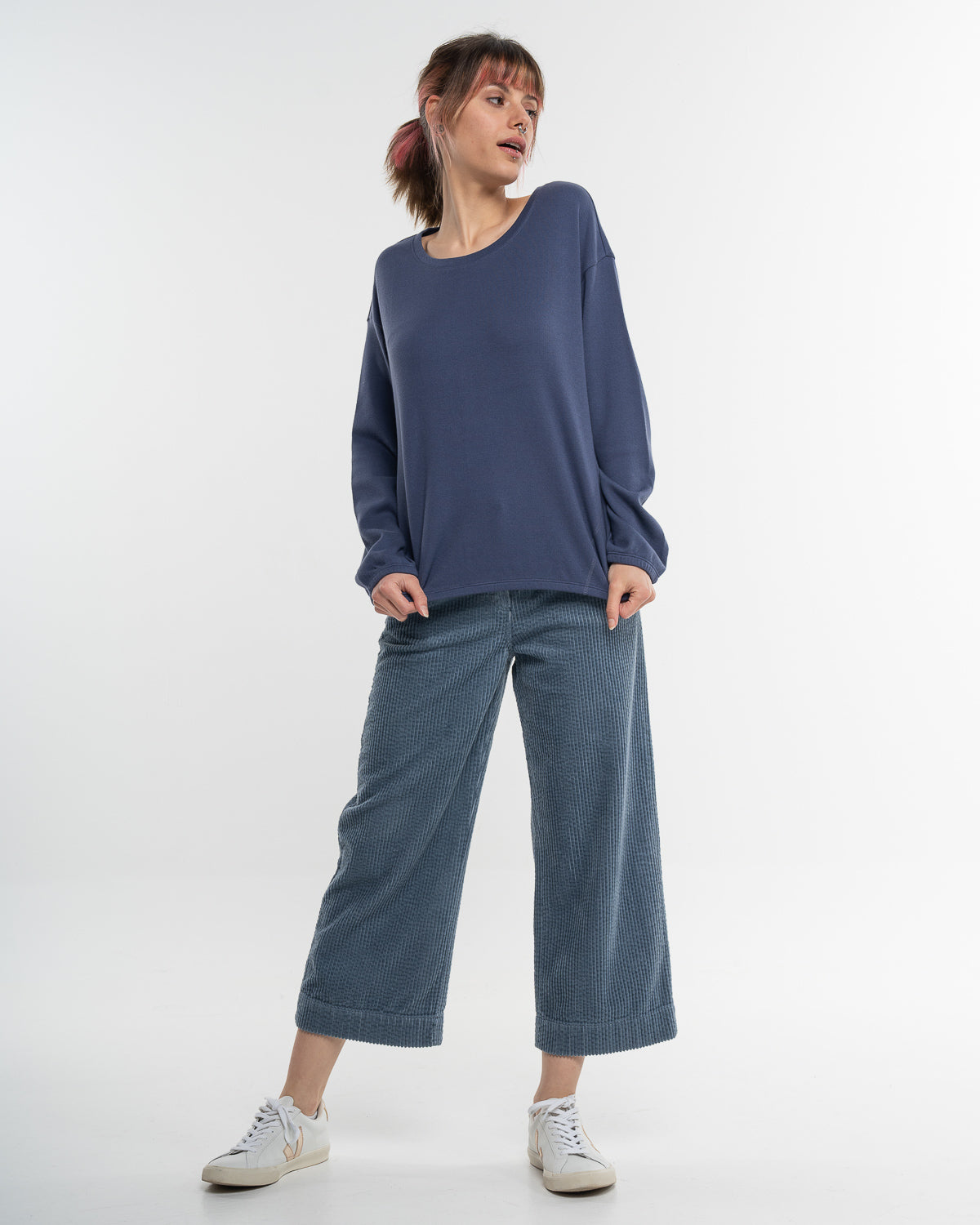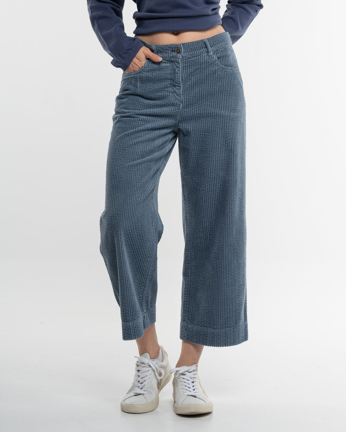 Die Hose Cablecord Culotte Dusty Blue bringt frischen Wind in Deine Garderobe. Der weiche, anschmiegsame Breitcord sorgt für ein angenehmes Tragegefühl und schenkt der Culotte ihren charakteristischen Fall. In trendigem Dusty Blue wirkt die Hose gleichzeitig lässig und edel – ein echtes Statement-Piece, das sich vielseitig kombinieren lässt.