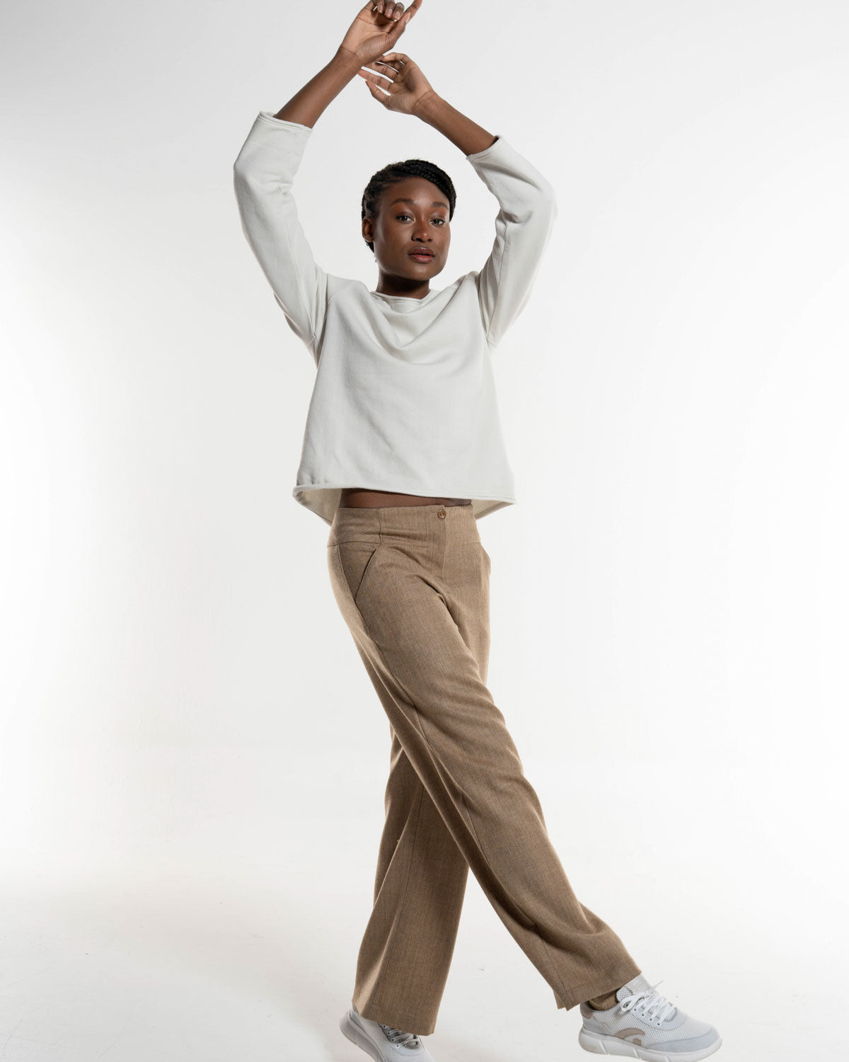 Der breite, glatte Bund mit Gürtelschlaufen formt eine klare Taille. Verschlossen wird die Hose klassisch mit Knopf und Reissverschluss. Seitliche Eingrifftaschen, schmal abgesteppte Nähte und ein breiter Saum runden den Look ab. Hinweis: Die Hose fällt etwas weiter aus – liegst Du zwischen zwei Grössen, wähle die kleinere.