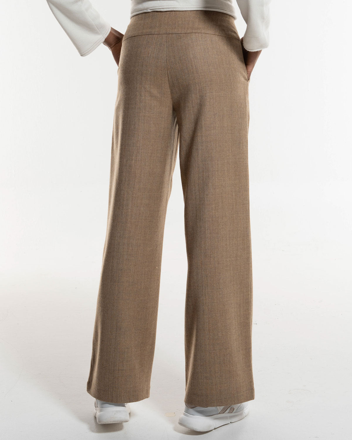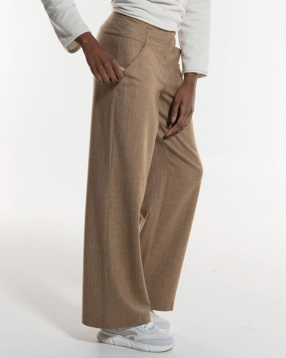 Die Hose Fischgrad Marlene Sand verbindet klassische Schneiderkunst mit moderner Silhouette. Das feine Fischgratmuster unterstreicht den edlen Look, das weite, leicht ausgestellte Bein sorgt für eine feminine Linie – perfekt für Business, City oder besondere Anlässe.