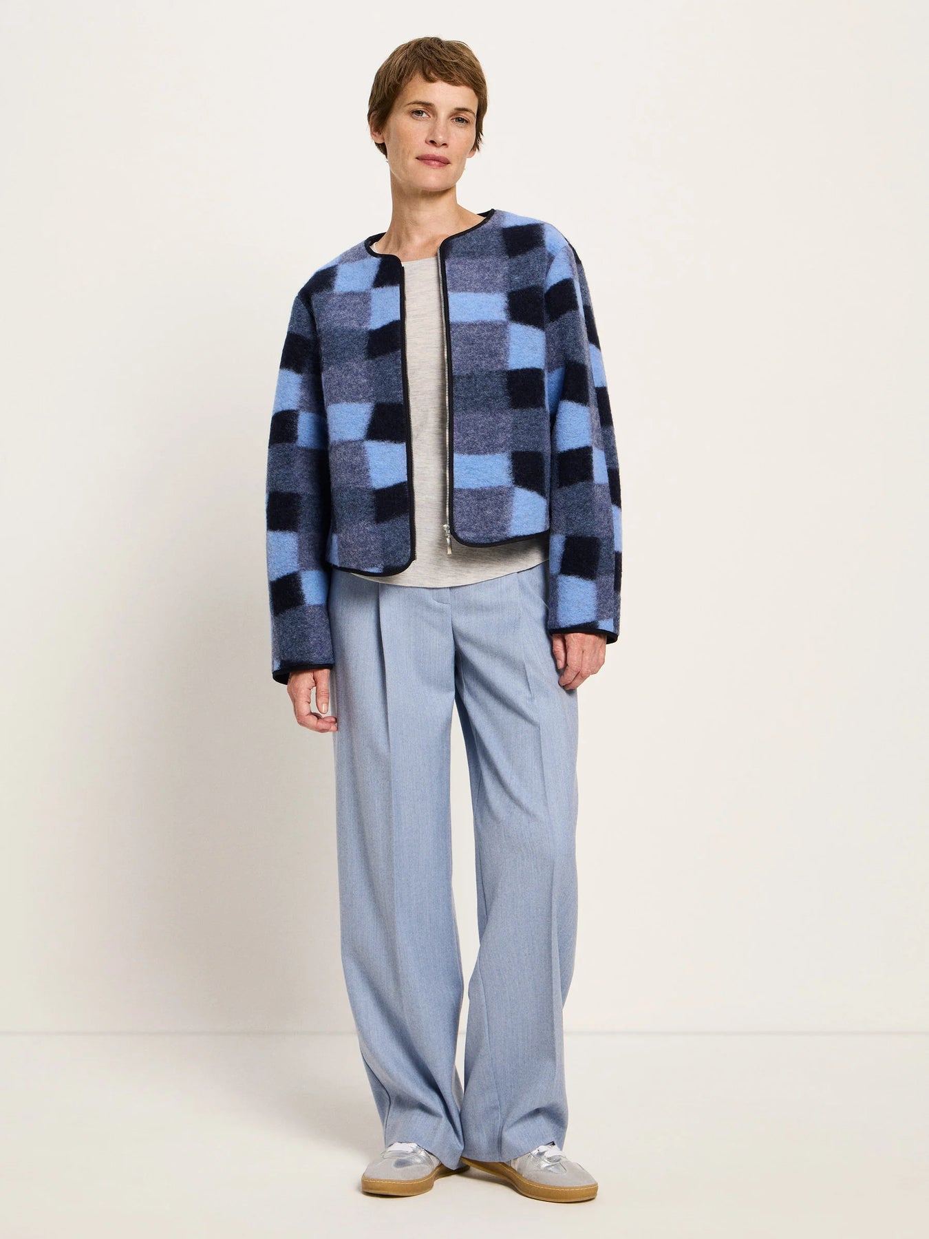 Die Karo Jacke Blue Multicolor bringt Farbe, Charakter & Stil in Deine Herbst- und Wintergarderobe. Die feste, strukturierte Woll-Baumwoll-Mischung hält angenehm warm, während die klare Silhouette & das moderne Karo-Design sofort ins Auge fallen. Perfekt für alle, die Mode bewusst & mit Ausdruck tragen wollen.