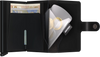 Anwendung: Einfach in das linke Kartenfach der SECRID-Geldbörse stecken. Am Stoffetikett ziehen, drehen, Münzen oder kleine Gegenstände einlegen und zurückdrehen.