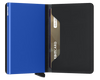 Die Slimwallet Matte Black & Blue kombiniert minimalistische Ästhetik mit maximalem Nutzen. Dank ihres flachen Profils verschwindet sie mühelos in jeder Hosen- oder Jackentasche, ohne aufzutragen. Das hochwertige Leder in tiefem Schwarz öffnet sich innen in einem kräftigen Blau und schafft ein modernes, elegantes Statement.