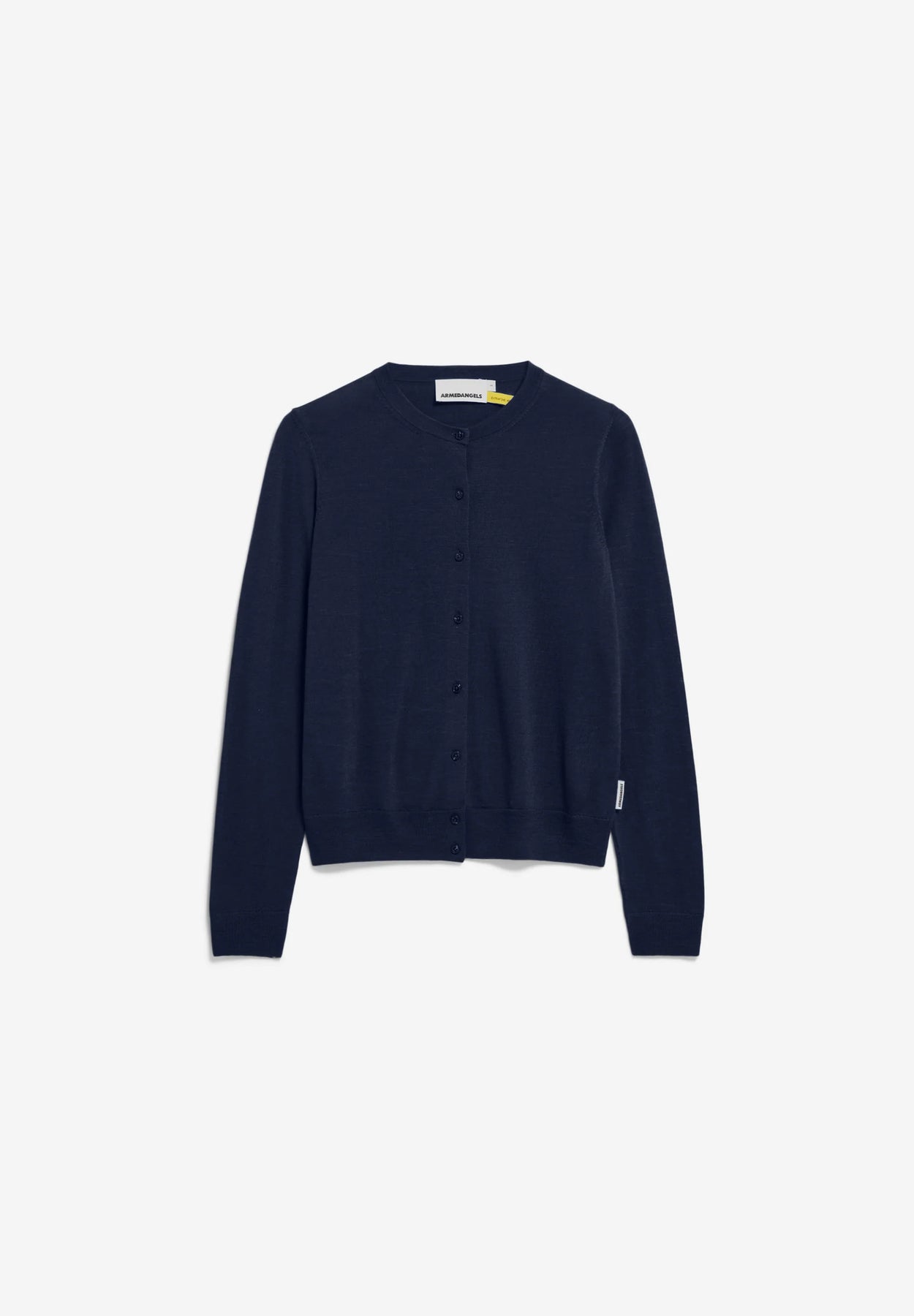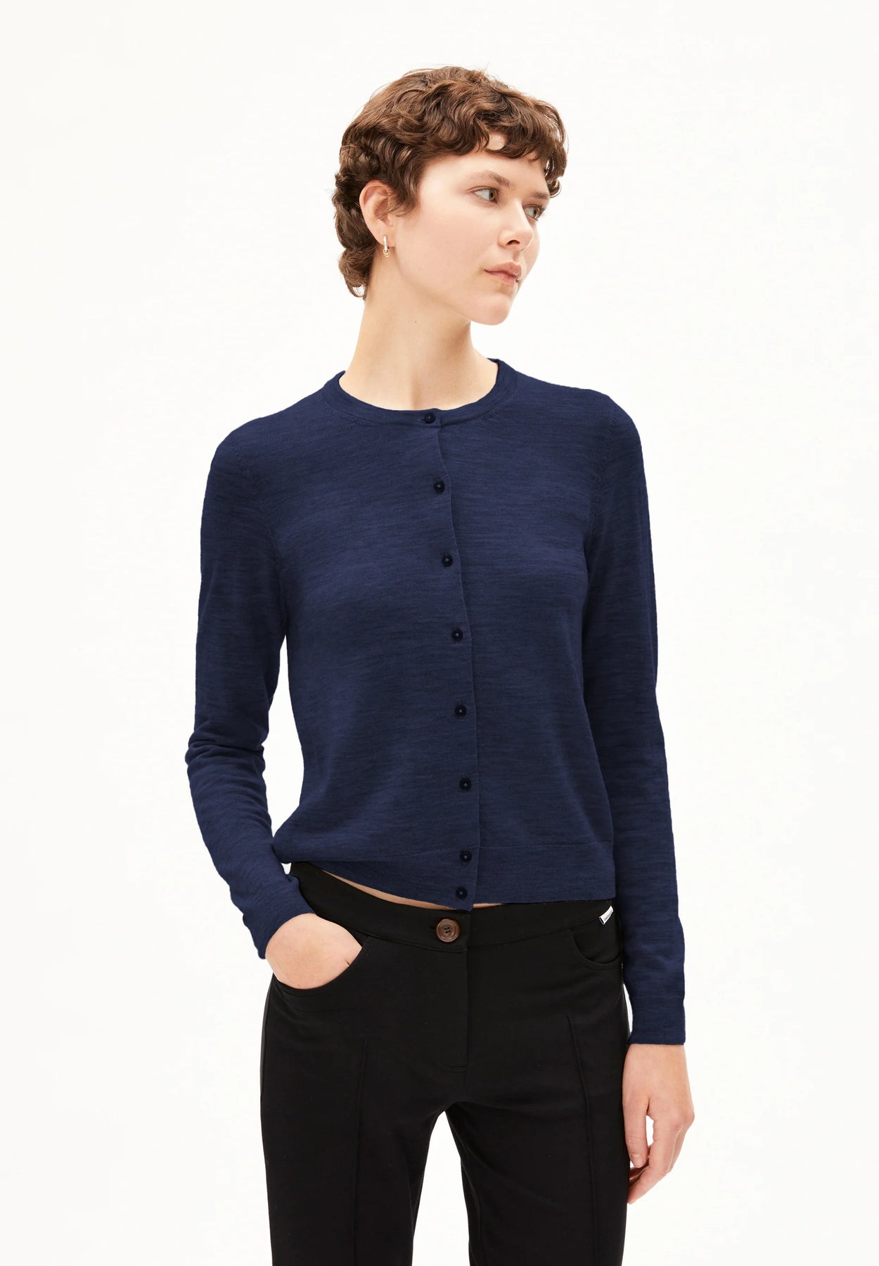 Der OPHALIAA Merino Cardigan in Tinted Navy überzeugt mit seiner schmalen Passform und dem eleganten Rundhalsausschnitt. Die klassische Knopfleiste macht ihn zum perfekten Begleiter für Büro, Freizeit oder Abend – immer stilvoll, immer zeitlos.