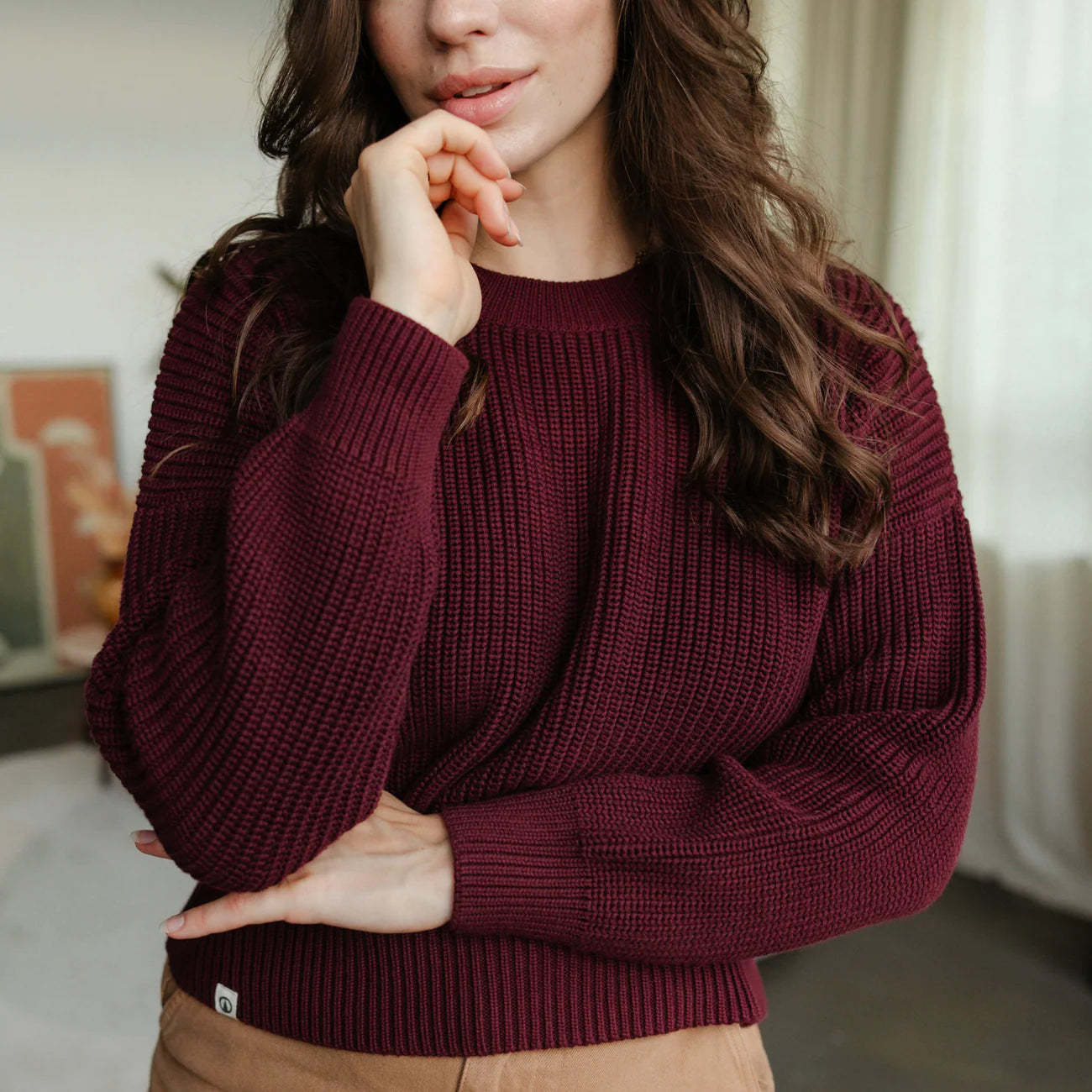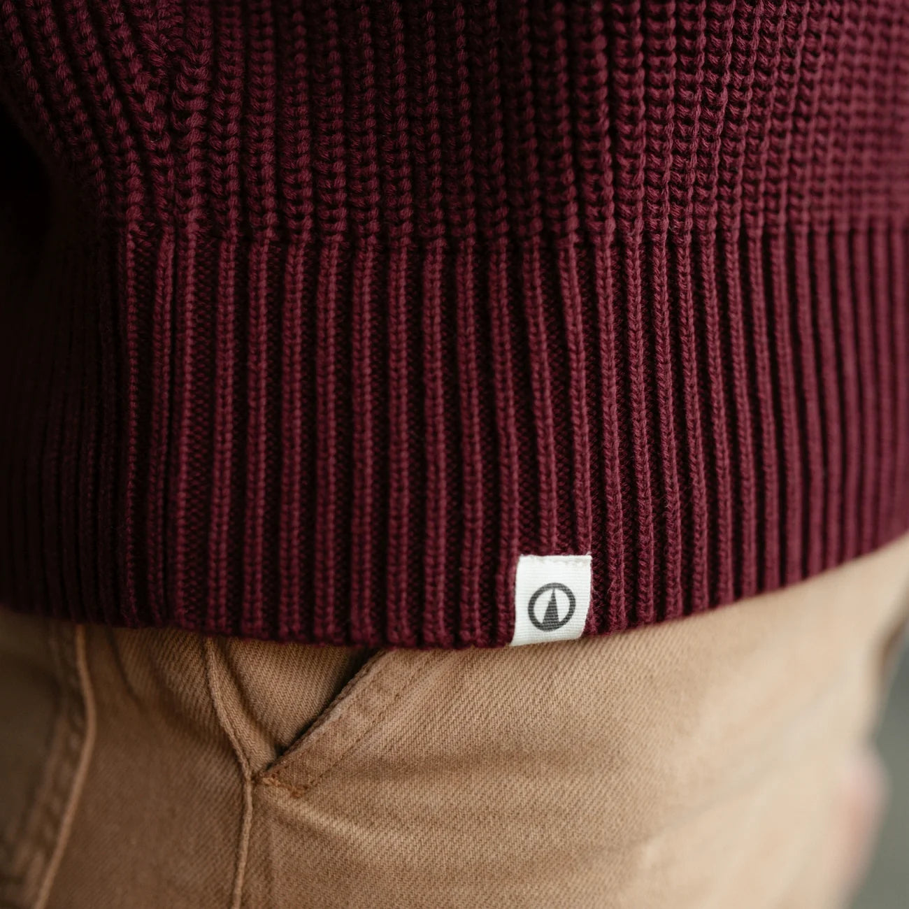 Der Pullover Mara in Dunkelrot bringt Wärme, Nachhaltigkeit und Stil zusammen. Sein Garn aus Bio- und recycelter Baumwolle sorgt für einen besonders weichen Griff und macht ihn zum verantwortungsbewussten Must-Have. Der kräftige Rotton setzt elegante Akzente und macht den Pullover vielseitig tragbar – von Alltag bis Abend.