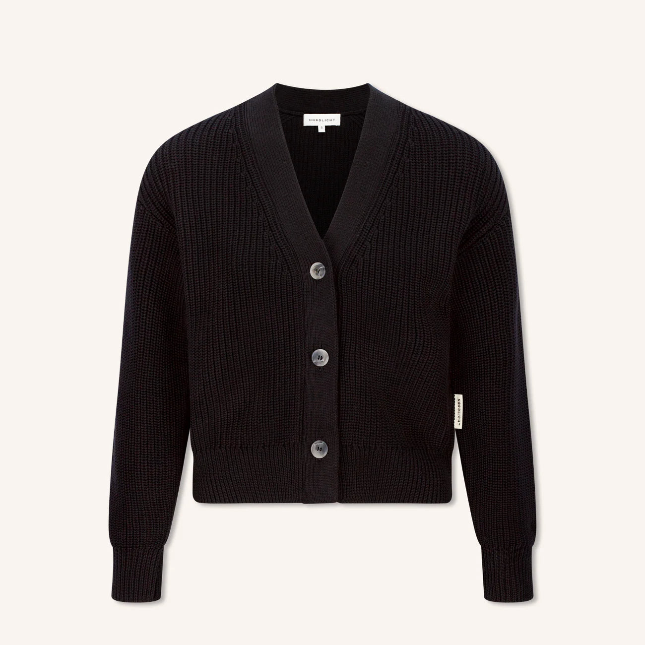 Dank ihrer schlichten Farbe und der robusten Strickstruktur ergänzt Marla Schwarz unterschiedlichste Outfits. Ob mit Jeans und T-Shirt, über einem Kleid oder als gemütliches Extra im Büro – diese Strickjacke passt einfach immer.