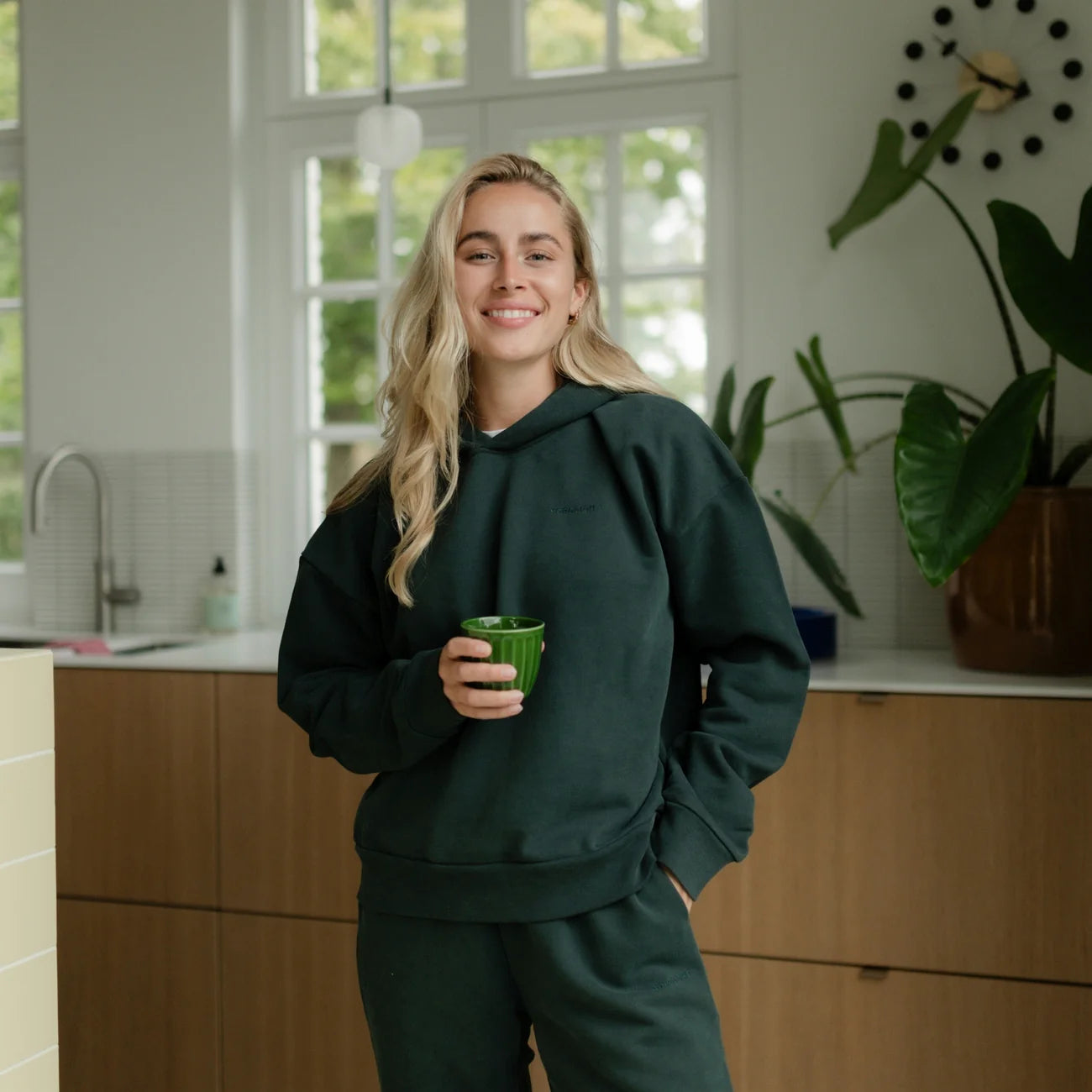 Der Hoodie Nissa in Waldgrün überzeugt durch seine aussergewöhnlich glatte und weiche Stoffstruktur. Er schenkt Dir ein luxuriöses Tragegefühl, das sich von herkömmlichen Hoodies abhebt. Mit seiner kräftigen Farbe und zeitlosen Silhouette ist er Dein zuverlässiger Begleiter für kühle Tage. Perfekt kombinierbar mit der Sweatpants Nova in Waldgrün – für einen stimmigen Look von Kopf bis Fuss.